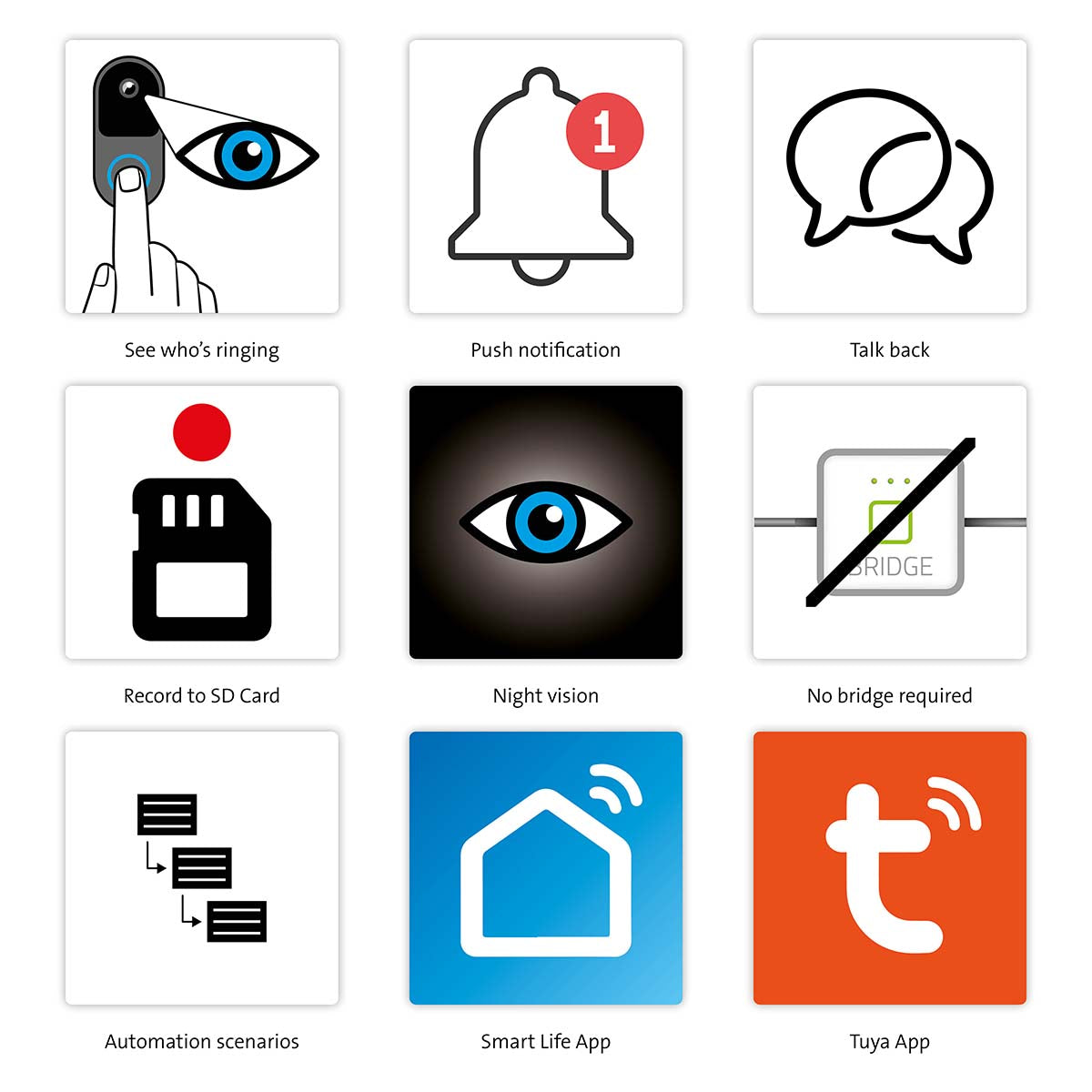 Die Funktürklingel arbeitet mit WiFi und kann problemlos direkt mit dem (Heim-)Netzwerk verbunden werden. Hierfür wird keine Bridge oder ein Gateway benötigt. Die Türklingel wird mit der kostenlosen Smart Life App von Tuya verbunden, die für alle iOS- und Android-Geräte heruntergeladen werden kann. In dieser App können alle Alecto Smart Life Produkte verwaltet werden.