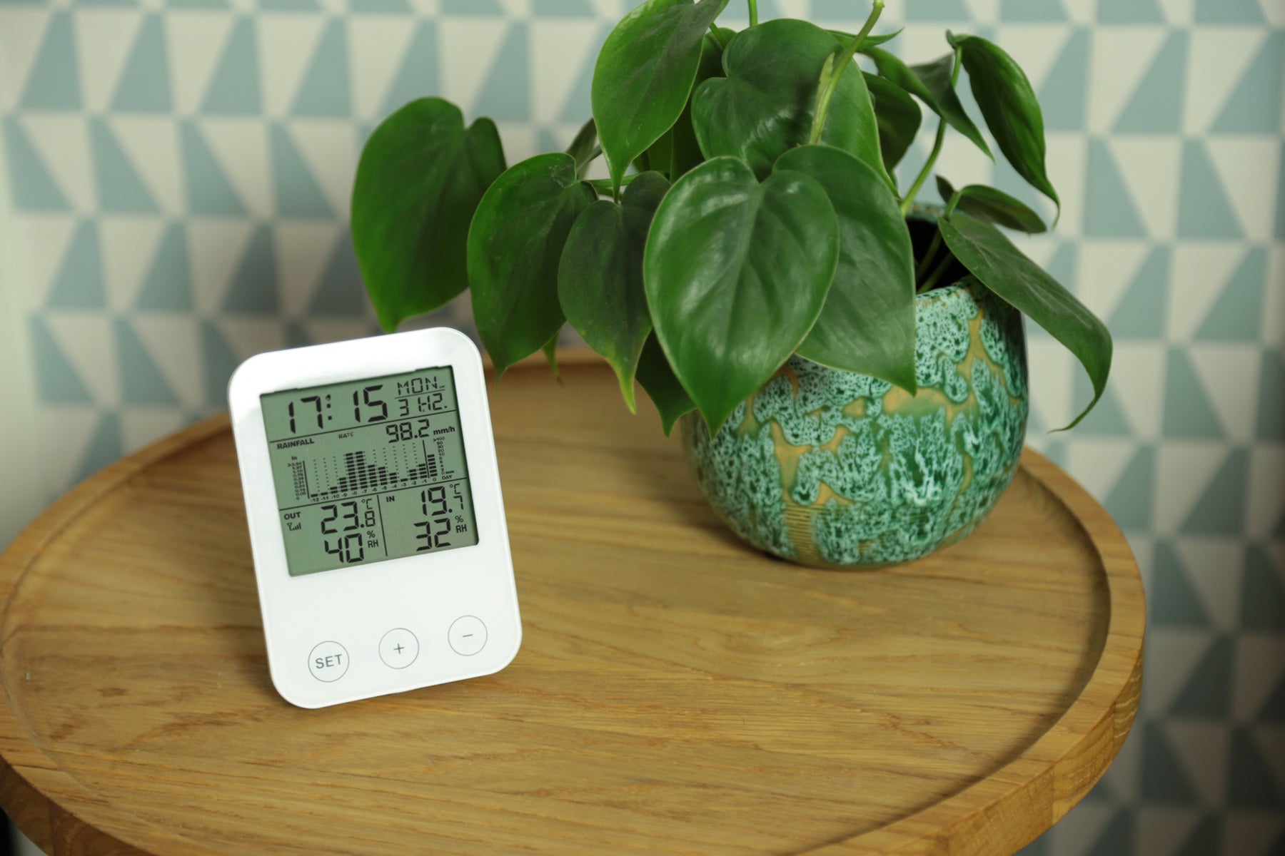 • Misst Temperatur, Luftfeuchtigkeit und Niederschlag me