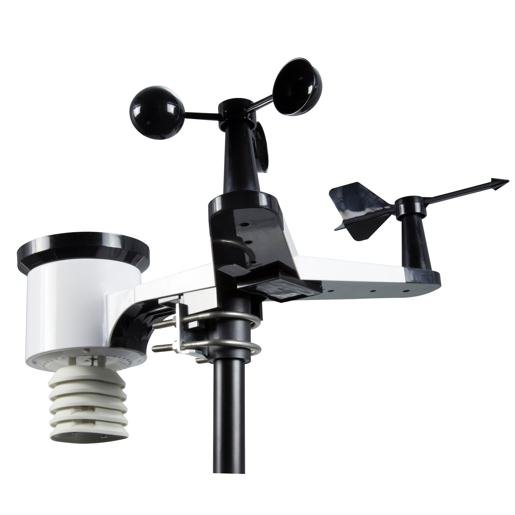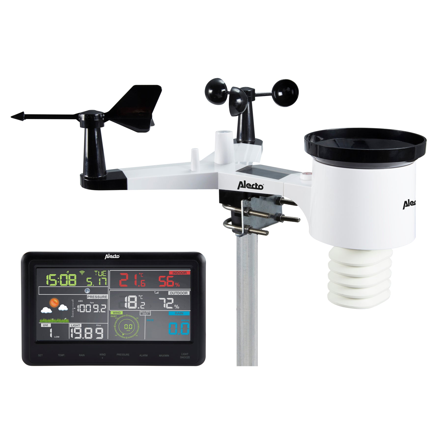 - Sensoren für: UV und Sonneneinstrahlung, Luftfeuchtigkeit, Windgeschwindigkeit und Windrichtung, Luftdruck, Innen-, Außen- und Empfindungstemperatur, Niederschlag